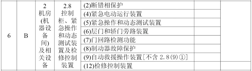 (4)將2.8項(xiàng)的項(xiàng)目及類別調(diào)整為“控制柜、緊急操作和動(dòng)態(tài)測(cè)試裝置及檢修控制裝置B”,在檢驗(yàn)內(nèi)容與要求中增加: