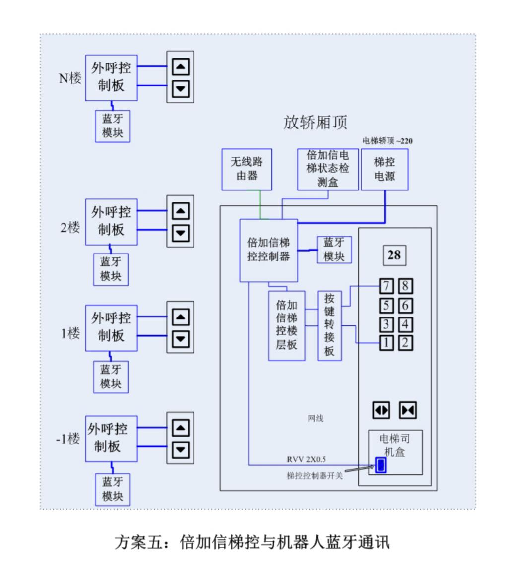 (1)機(jī)器人在電梯外,通個(gè)藍(lán)牙連接發(fā)送指令倍加信梯控系統(tǒng),系統(tǒng)自動(dòng)點(diǎn)亮上樓或下樓按鍵,實(shí)現(xiàn)呼梯功能。