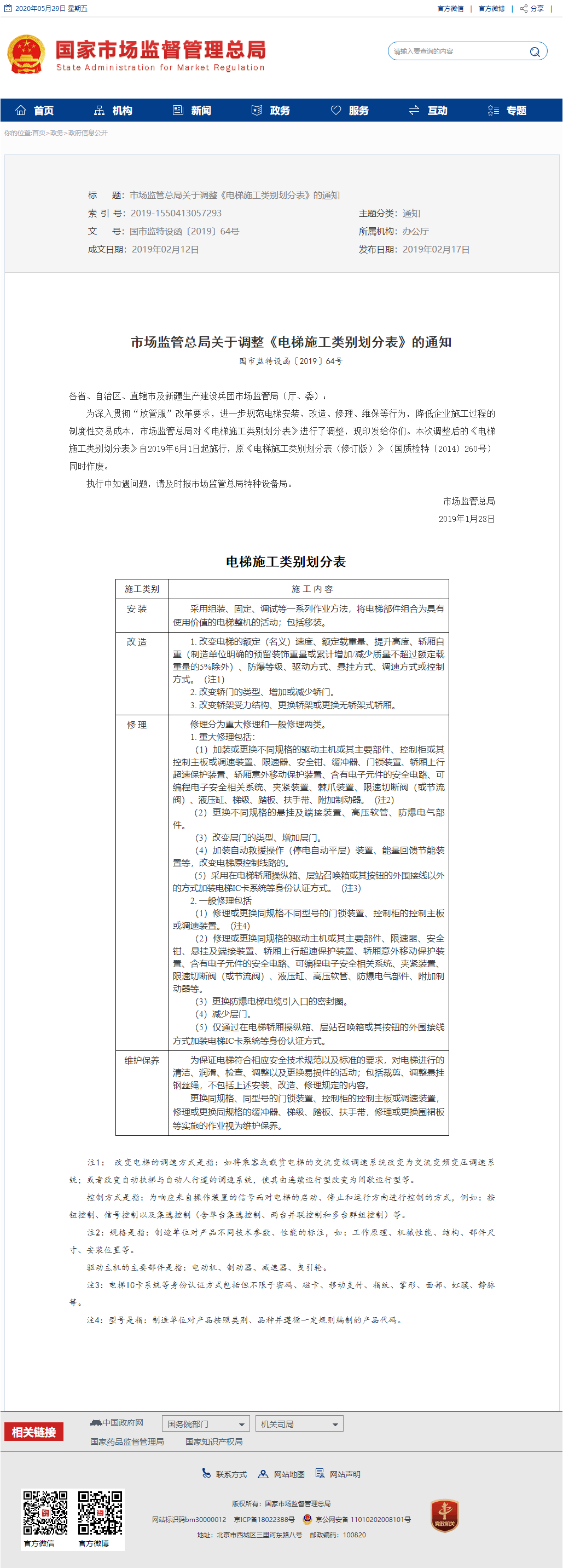 為深入貫徹“放管服”改革要求,進(jìn)一步規(guī)范電梯安裝、改造、修理、維保等行為,降低企業(yè)施工過程的制度性交易成本,市場監(jiān)管總局對《電梯施工類別劃分表》進(jìn)行了調(diào)整,現(xiàn)印發(fā)給你們。本次調(diào)整后的《電梯施工類別劃分表》自2019年6月1日起施行,原《電梯施工類別劃分表(修訂版)》(國質(zhì)檢特〔2014〕260號)同時(shí)作廢。