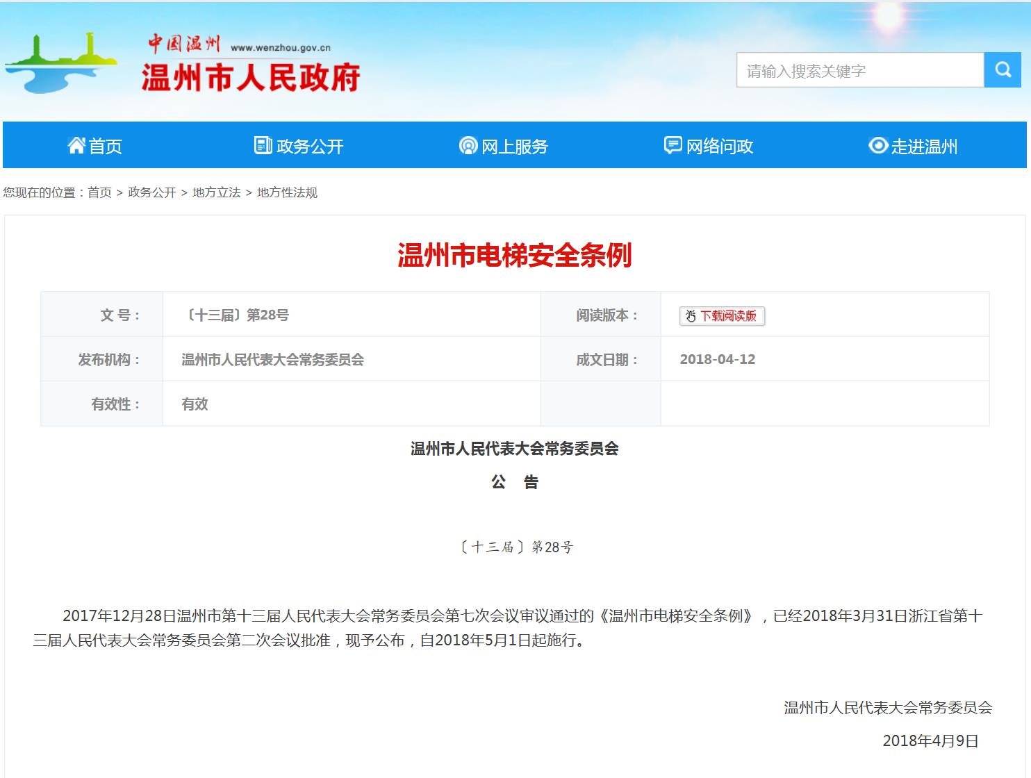 2017年12月28日溫州市第十三屆人民代表大會常務(wù)委員會第七次會議審議通過的《溫州市電梯安全條例》,已經(jīng)2018年3月31日浙江省第十三屆人民代表大會常務(wù)委員會第二次會議批準(zhǔn),現(xiàn)予公布,自2018年5月1日起施行。