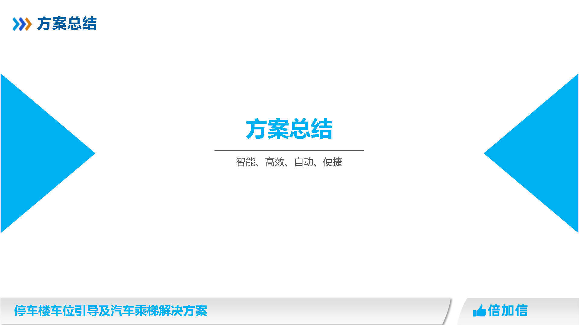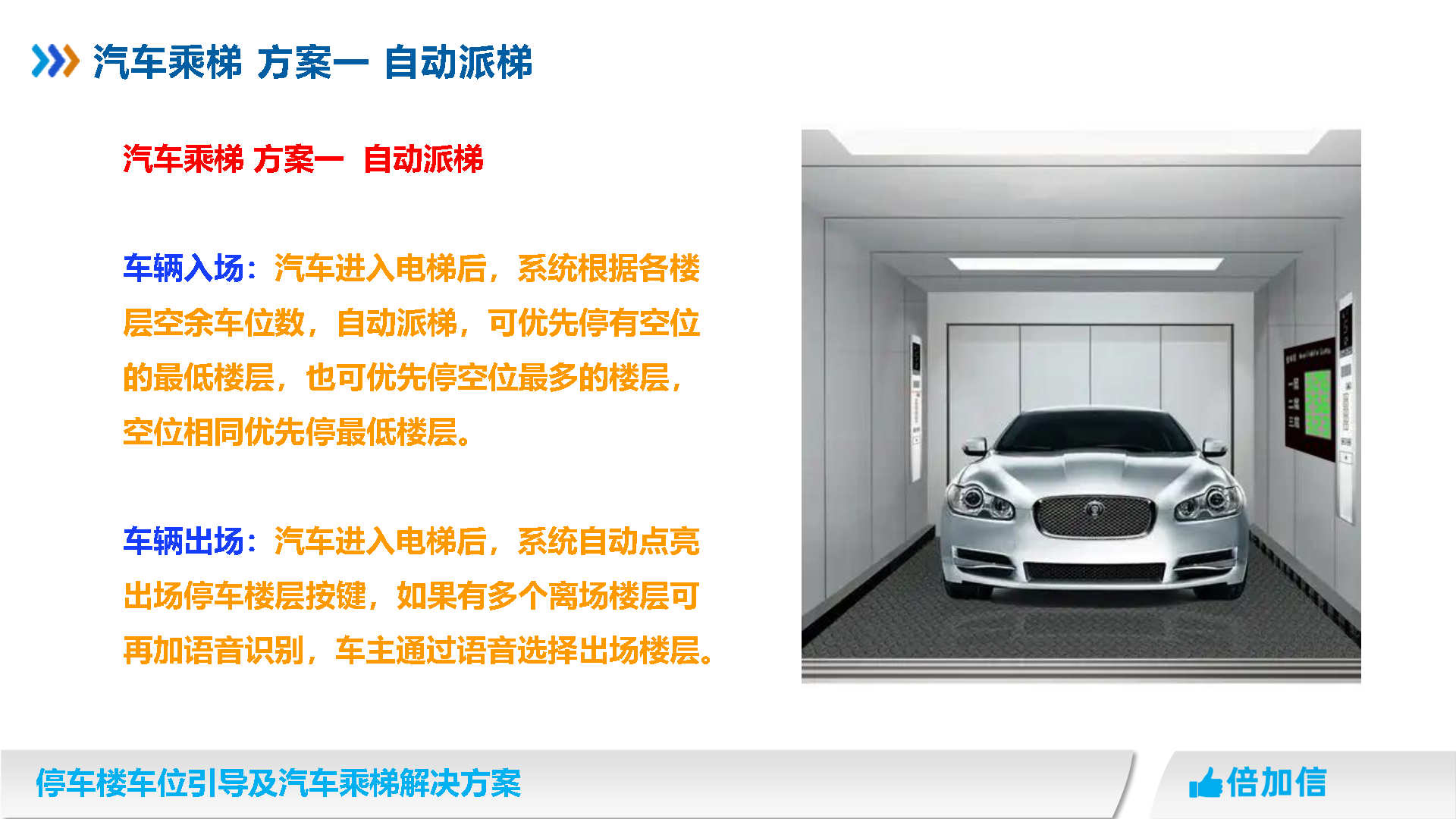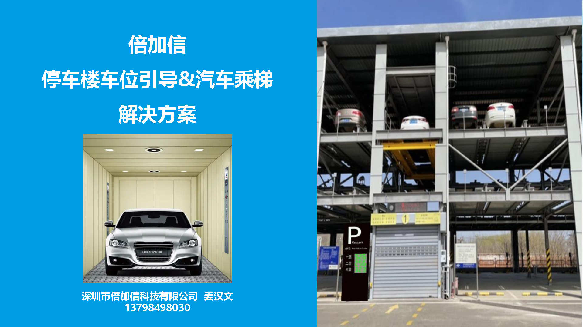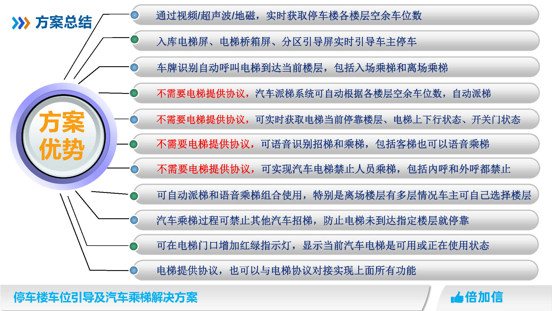 倍加信汽車(chē)乘梯系統(tǒng)方案優(yōu)勢(shì) 1、通過(guò)視頻/超聲波/地磁,實(shí)時(shí)獲取停車(chē)樓各樓層空余車(chē)位數(shù)/ 2、入庫(kù)電梯屏、電梯橋箱屏、分區(qū)引導(dǎo)屏實(shí)時(shí)引導(dǎo)車(chē)主停車(chē) 3、車(chē)牌識(shí)別自動(dòng)呼叫電梯到達(dá)當(dāng)前樓層,包括入場(chǎng)乘梯和離場(chǎng)乘梯 4、不需要電梯提供協(xié)議,汽車(chē)派梯系統(tǒng)可自動(dòng)根據(jù)各樓層空余車(chē)位數(shù),自動(dòng)派梯 5、不需要電梯提供協(xié)議,可實(shí)時(shí)獲取電梯當(dāng)前?繕菍印㈦娞萆舷滦袪顟B(tài)、開(kāi)關(guān)門(mén)狀態(tài) 6、不需要電梯提供協(xié)議,可語(yǔ)音識(shí)別招梯和乘梯,包括客梯也可以語(yǔ)音乘梯 7、不需要電梯提供協(xié)議,可實(shí)現(xiàn)汽車(chē)電梯禁止人員乘梯,包括內(nèi)呼和外呼都禁止 8、可自動(dòng)派梯和語(yǔ)音乘梯組合使用,特別是離場(chǎng)樓層有多層情況車(chē)主可自己選擇樓層 9、汽車(chē)乘梯過(guò)程可禁止其他汽車(chē)招梯,防止電梯未到達(dá)指定樓層就? 10、可在電梯門(mén)口增加紅綠指示燈,顯示當(dāng)前汽車(chē)電梯是可用或正在使用狀態(tài) 11、電梯提供協(xié)議,也可以與電梯協(xié)議對(duì)接實(shí)現(xiàn)上面所有功能