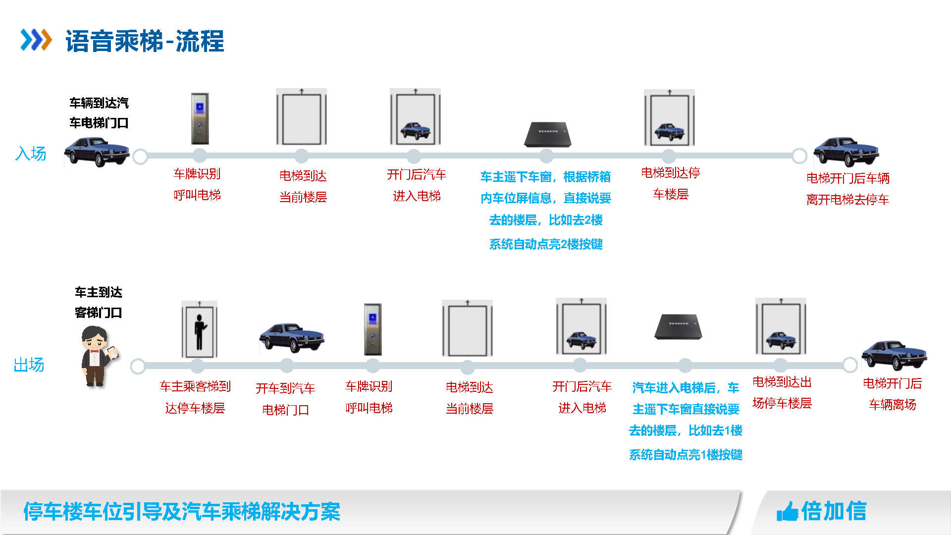 汽車(chē)乘梯 方案二 語(yǔ)音乘梯 車(chē)輛入場(chǎng):汽車(chē)進(jìn)入電梯后,車(chē)主遙下車(chē)窗,根據(jù)電梯橋箱內(nèi)車(chē)位顯示屏顯示信息,直接說(shuō)去2樓、去3樓或者去4樓,電梯自動(dòng)點(diǎn)亮對(duì)應(yīng)樓層按鍵。 車(chē)輛出場(chǎng):汽車(chē)進(jìn)入電梯后,車(chē)主遙下車(chē)窗,直接說(shuō)去1樓或者去負(fù)1樓,電梯自動(dòng)點(diǎn)亮對(duì)應(yīng)樓層按鍵。