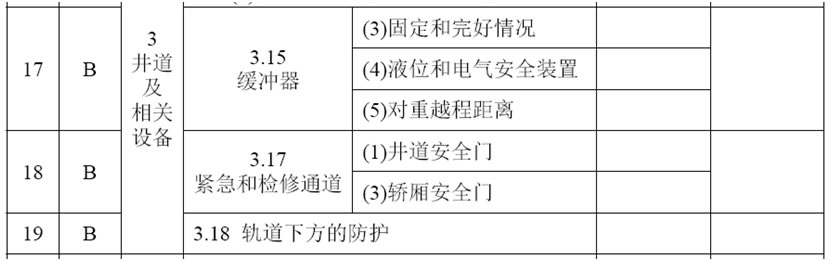 (17)增加3.18項(xiàng),項(xiàng)目及類別為:“軌道下方的防護(hù) B”,檢驗(yàn)內(nèi)容與要求為:“如果人員可以進(jìn)入電梯運(yùn)行軌道的下方,應(yīng)當(dāng)設(shè)置無孔的防護(hù)隔障,以擋住和收納可能從斜行電梯上掉落的碎片或者零件”;